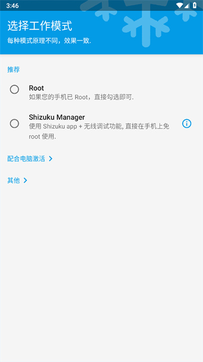 掀开 Shizuku 后抉择“无线调试”启动(适用于 Android 11 及以上零星)